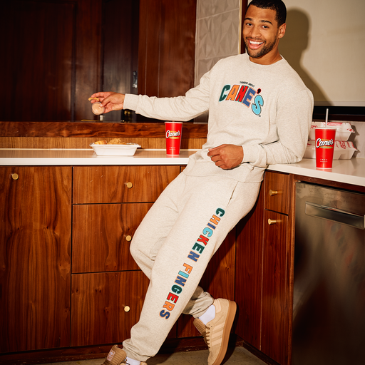 Thinking About Cane's SweatpantsOriginal price $44.99 - Original price $44.99Original price$44.99$44.99 - $44.99Current price $44.99| /Slip into the Thinking About Cane’s sweatpants in soft heather grey fleece, finished with bold multicolor “Chicken Fingers” graphics running down t...